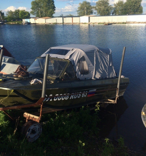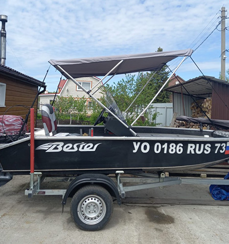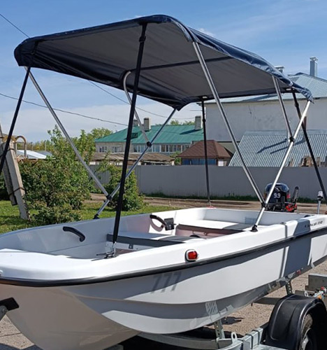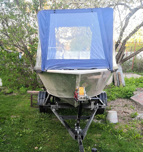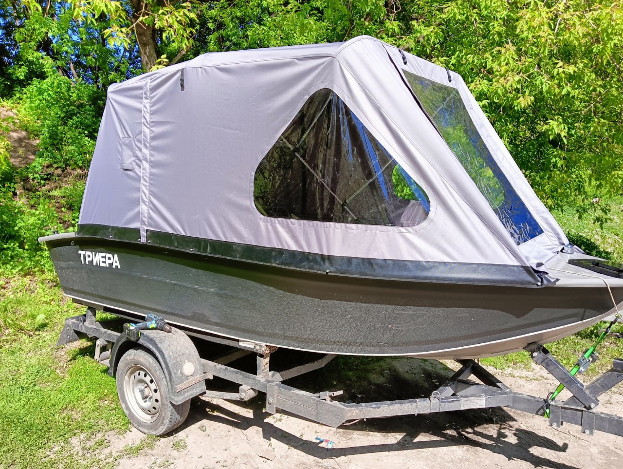 Тент с задней дверью для выхода к мотору, небольшими боковыми окнами и усиленными краями для установки застёжек. Изготовлен из специализированной тентовой ткани Оксфорд 600 повышенной плотности